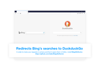 Bing to DuckduckGo, Firefox tarayıcısı için geliştirilmiş bir uzantıdır ve kullanıcıların Bing arama sonuçlarını DuckduckGo'ya yönlendirmesine olanak tanır. Bu uzantı, kullanıcıların daha özel bir arama deneyimi yaşamasını sağlamak amacıyla tasarlanmıştır. Uzantı, Edge deflector ile entegre edildiğinde, Cortana araç çubuğu üzerinden DuckduckGo ile özel arama yapma imkanı sunar.
